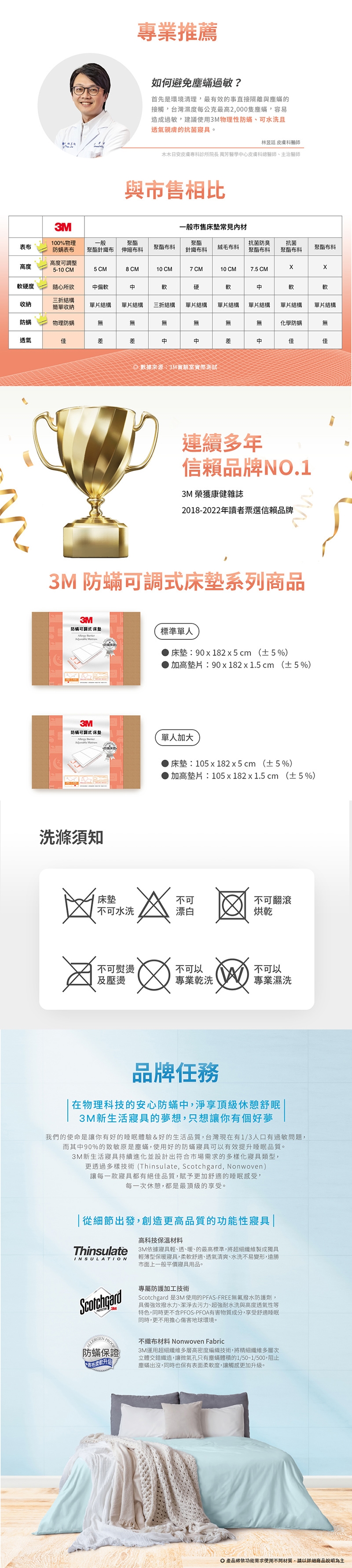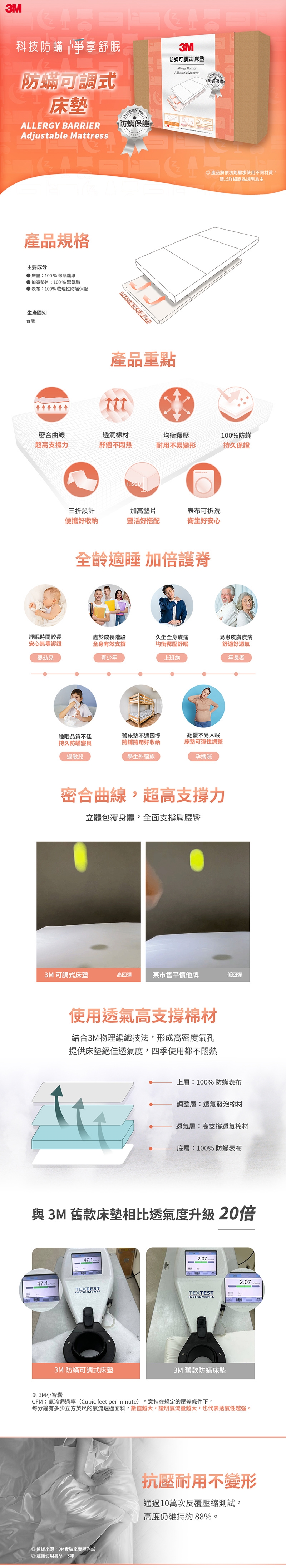 ◆3M防蹣床墊主要是由聚酯胺材質製成,經實驗後加強局部釋壓點,讓你睡眠中放鬆又舒適。