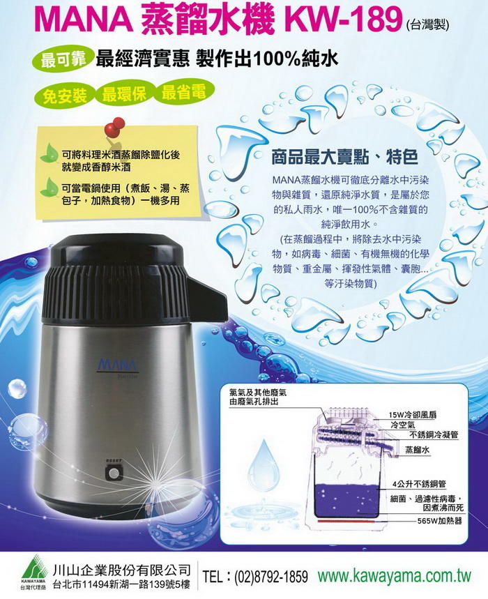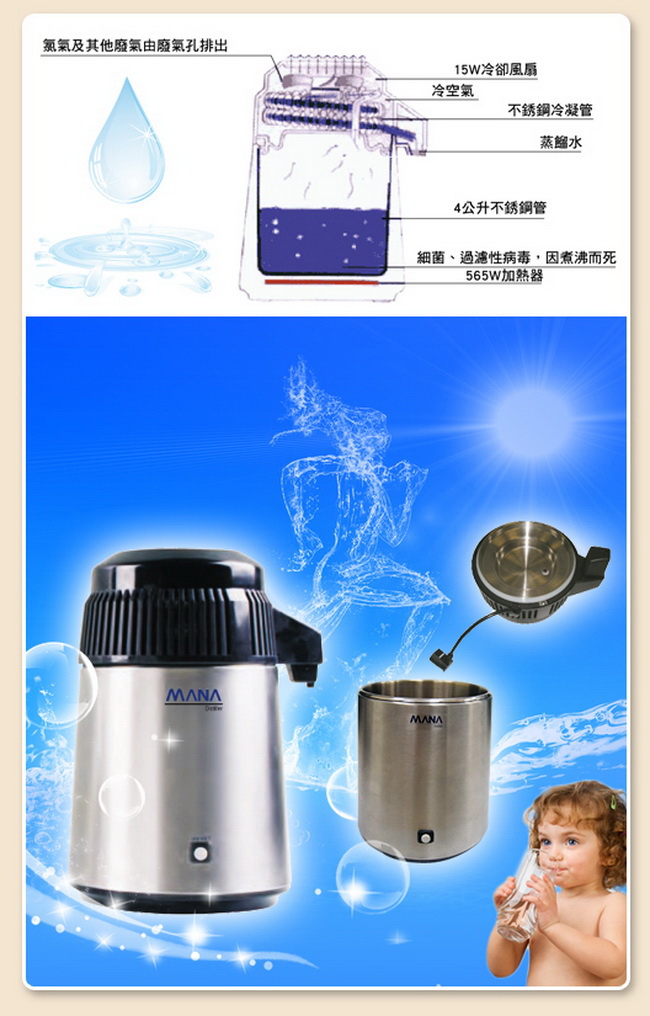 MANA蒸餾水機製造純水系統簡單而有效率, 不會造成任何浪費, 最環保