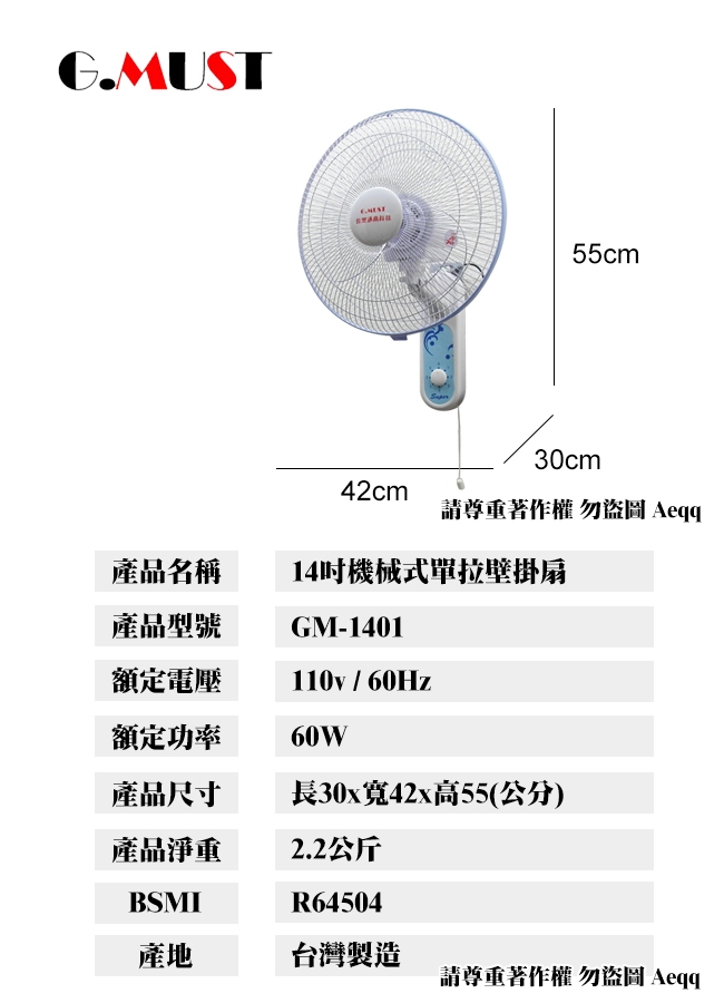 G.MUST 台灣通用14吋節能單拉壁掛扇(GM-1401)