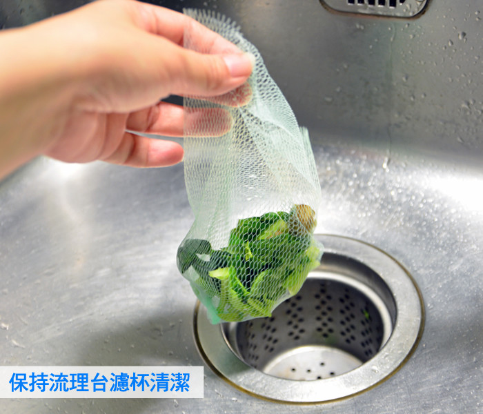 先將流理台的濾杯取出,輕輕張開濾水網的開口套在濾杯的邊緣