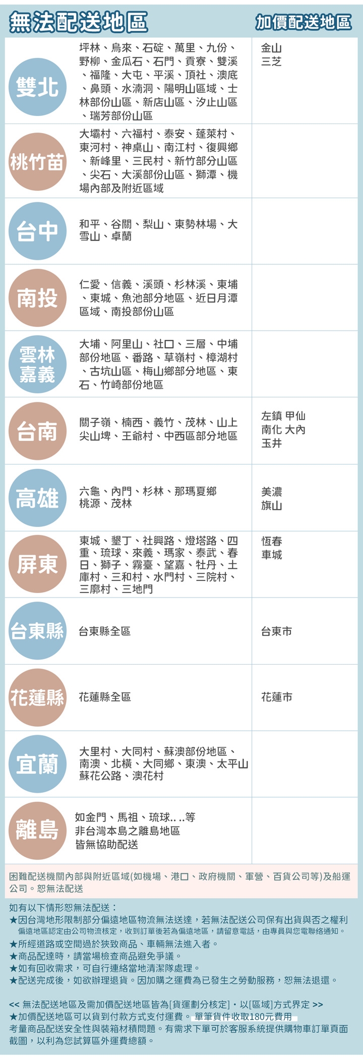 1.實因特殊地型、偏遠鄉鎮限制無法送貨時,本公司保有出貨與否權利,如您仍有訂購需求,則另外收取運費。(您可直接訂購,運費後續由專員和您報價,如有退貨,加收之運費因為已發生勞動服務無法退還)。
