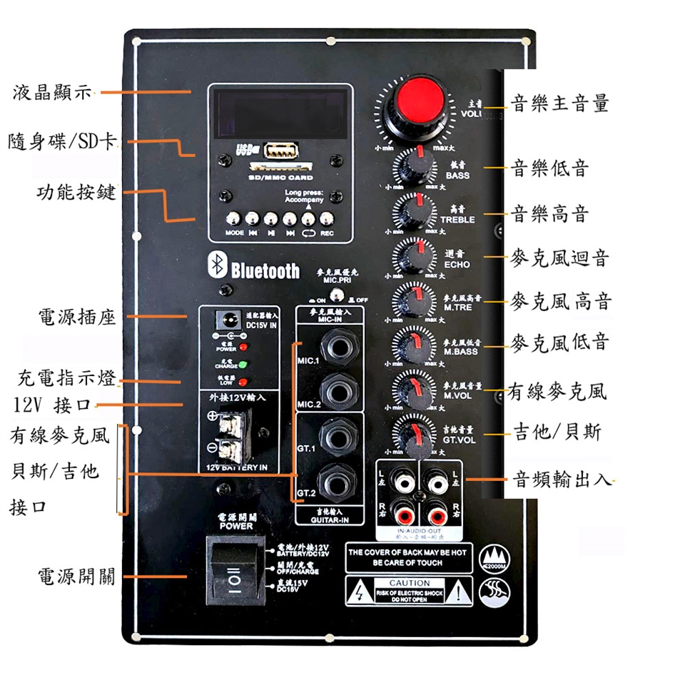 支援卡拉OK歡唱,可調整主音/高音/低音/ECHO回音。配有吉他及貝斯等樂器專用輸入孔座,可做樂器演奏及演唱使用