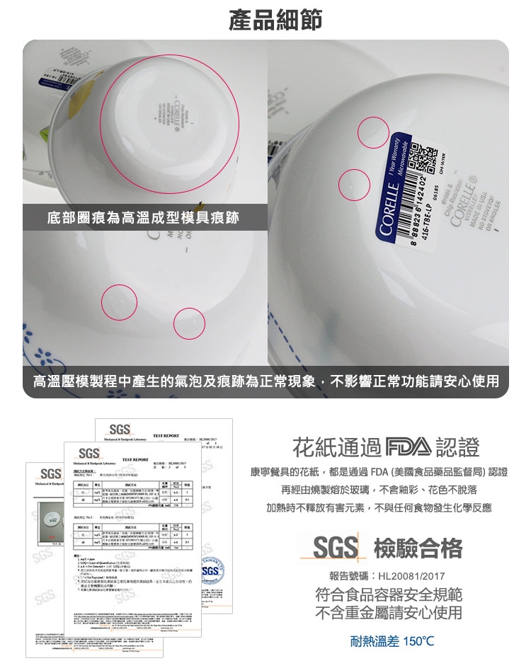 ※康寧餐具掉落或是碰撞到堅硬的物體上時,有可能會立即破裂,或此撞擊超過結構強度的負荷,而造成內部結構受損,而在日後未因明顯外力因素而破裂。