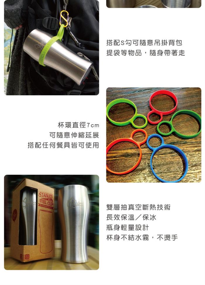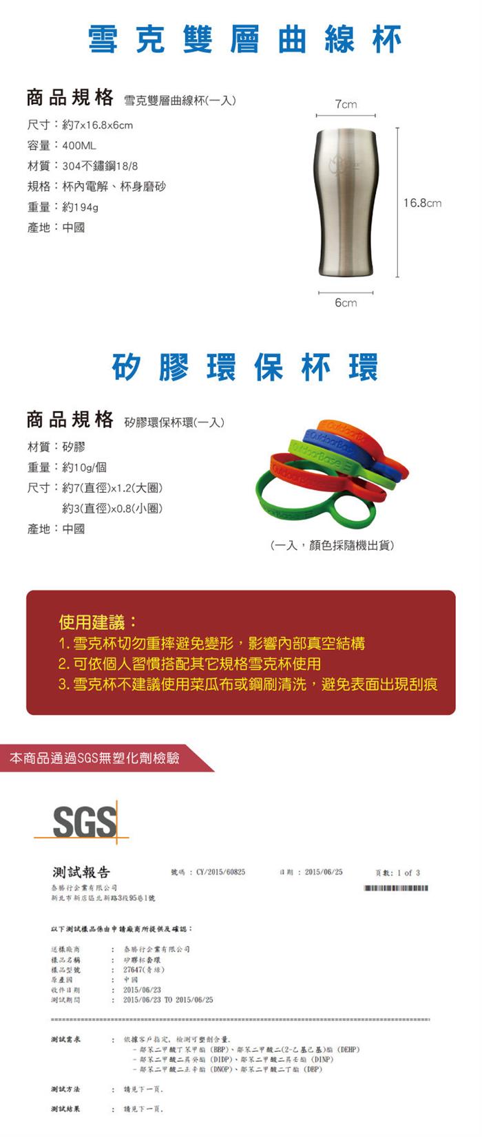 使用建議:1.雪克杯切勿重摔避免變形,影響內部真空結構2.可依個人習慣搭配其它規格雪克杯使用3.雪克杯不建議使用菜瓜布或鋼刷清洗,避免表面出現刮痕雪克雙層曲線杯450ML(一入)尺寸:約7x16.8x6cm容量:400ML材質:304不鏽鋼18/8規格:杯內電解、杯身磨砂 重量:約194g產地:中國矽膠環保杯環(一入)材質:矽膠重量:約10g/個尺寸:約7(直徑)x1.2(大圈) 約3(直徑)x0.8(小圈)產地:中國商品尺寸因測量方式、收納方式不同,可能造成誤差,請以實際商品尺寸為主商品顏色因拍攝光線與電腦螢幕設定不同,可能造成色差,請以實際商品顏色為主