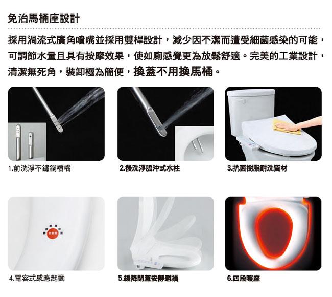 本商品需插電使用,故馬桶蓋附近須備有插座供其使用。