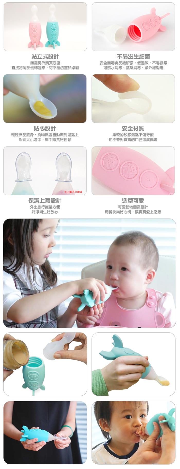 安全柔軟材質,不傷害寶寶幼嫩的口腔。軟式湯匙設計是寶寶準備由吸吮階段轉換至副食品階段最佳哺育用品。食品級矽膠材質,不含環境賀爾蒙雙酚A(BPA)、塑化劑、PVC。獨特可愛造型 輕輕擠壓,不論何種角度皆容易放進寶寶口腔。輕輕擠壓瓶身,寶寶成長所需要的營養副食品就會從湯匙上的小孔流出,讓寶寶愉快吸收每一份媽咪精心準備的營養食物。