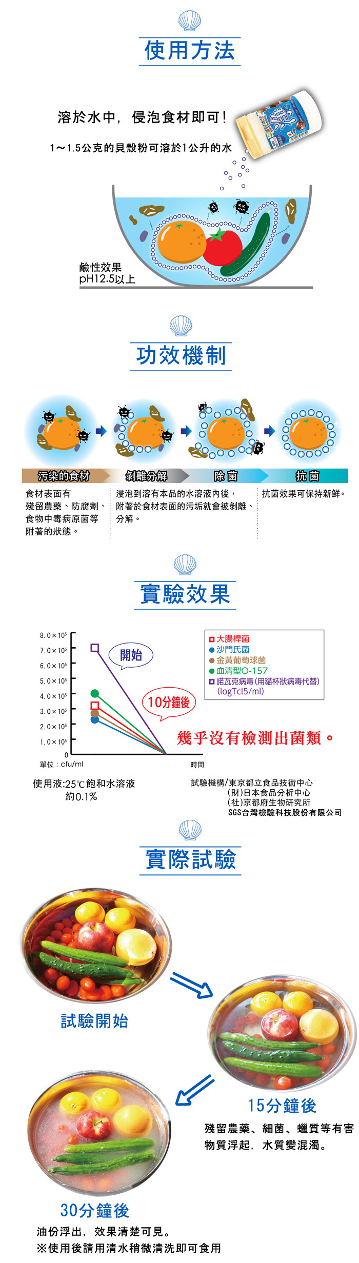 2) 將食材, 蔬果浸泡15-30分鐘取出,再用清水沖洗後即可食用或料理。