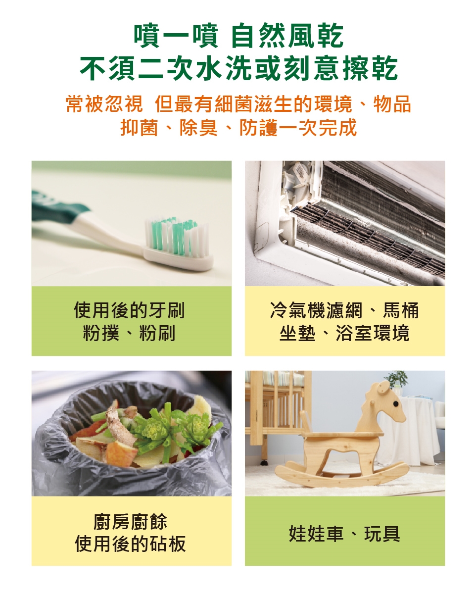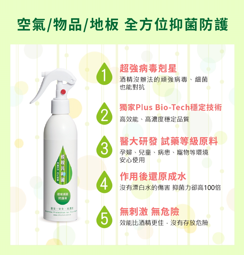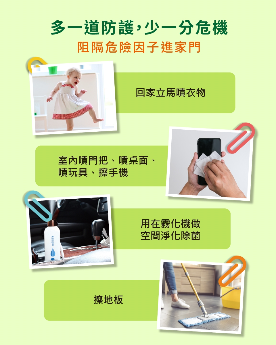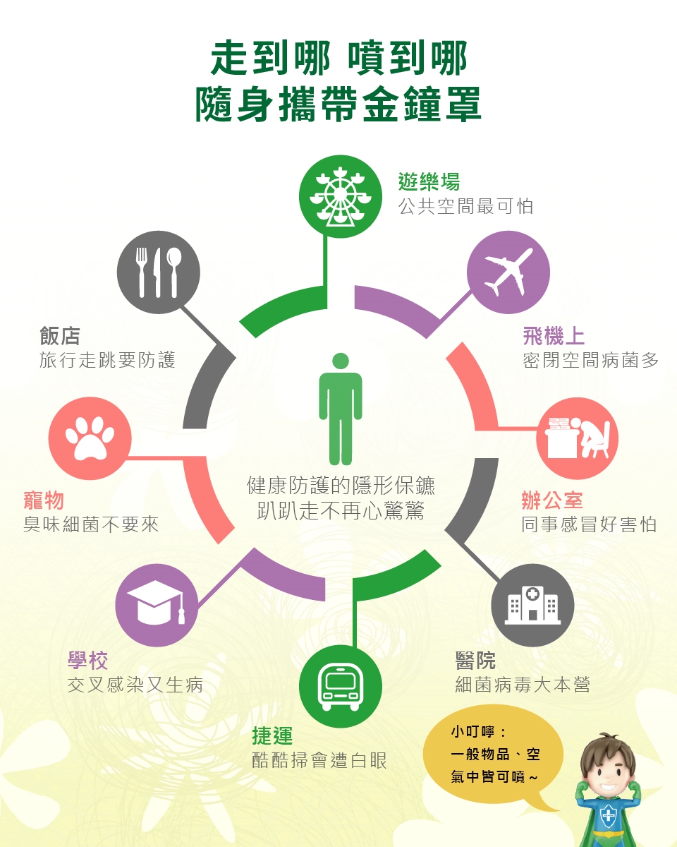 使用方法:請直接將環境滅菌液均勻噴灑於外部環境公共場合,如醫院、學校、遊樂場、公共廁所等,即可快速達到抑菌防護同時達到消除環境異味之功效。