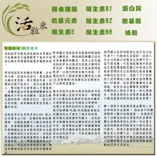 活粒米是以秈稻及梗稻混育而成的優良品種,口感香味皆優於其他品種,其蛋白質均在7 %以下。具有優秀的抗病蟲害能力,米粒飽滿在燈光下的質感更是柔亮剔透,口感鬆軟黏Q,是全台最好吃的良質米品種。顆粒大、米粒完整近乎圓形,呈水晶體色澤透明煮熟後米飯Q軟且有黏性,在口碑上評價極高,需求量亦大。在甜度方面不遜於越光米,更耐於長時間保存,隔餐用時只要加水蒸便可呈現原本的風味,且於涼後無損其香味。我們秉持著良心事業從農地土壤檢測到品管銷售全程透明化管理就是要讓消費者安心選購並食用。