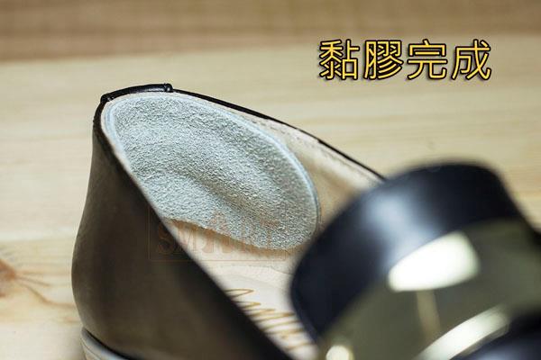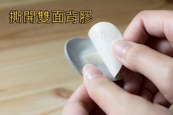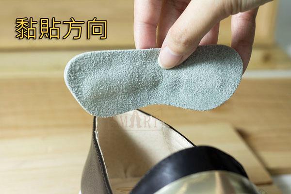 2. 撕開背膠貼紙以手紙按壓確實黏貼在後跟內側上半部。