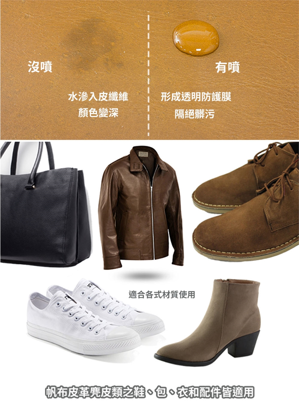 可產生保護層,防水、抵抗油污,同時保持原有的透氣性。