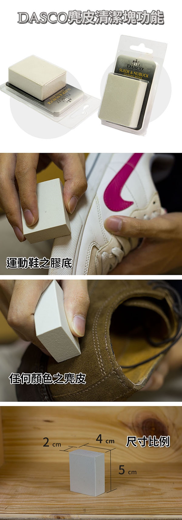 功能:使用如橡皮擦般簡單,哪裡髒就擦哪裡,不會留下髒污的痕跡。體積小,方便攜帶,不會刮傷麂皮絨面。髒鞋立刻變新鞋。 各種顏色的皮面皆可使用。