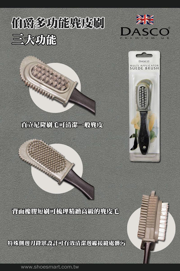 功能:直立刷毛可清潔一般麂皮,背面橡膠短刷可梳理精緻高級的麂皮毛。側邊刀片設計可清潔接縫地方的髒污,鋸齒刷可清潔車縫夾縫污垢。一般麂皮製品必備的多功能清潔工具。