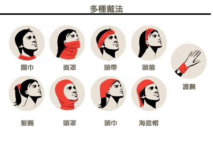 各式流行頭巾綁法,一年四季皆可使用的超神奇流行時尚魔術頭巾,採用超細纖維製成,質地輕薄柔軟,攜帶方便,具吸濕排汗特性,不悶熱。圓筒無接縫設計,無須技巧可做出多樣化造型,防風保暖,沒有年齡場地限制。