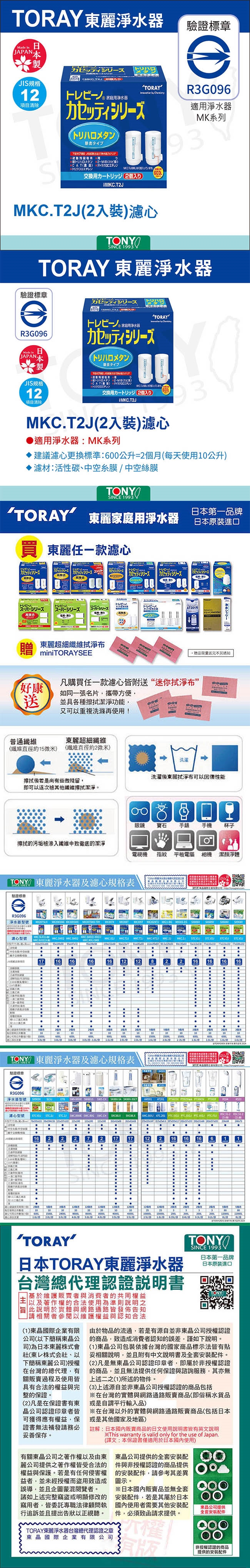 來自日本市佔率第一的東麗TORAY濾心MKC.T2J (2入),獨特的三層式中空糸膜具有極佳的濾水效果,能有效濾除水中的污濁、鐵鏽、細菌、氯化物及三鹵甲烷,讓使用者能飲用到高品質的飲用水。每天飲用,幫助您體內代謝順暢,讓您生活更健康!