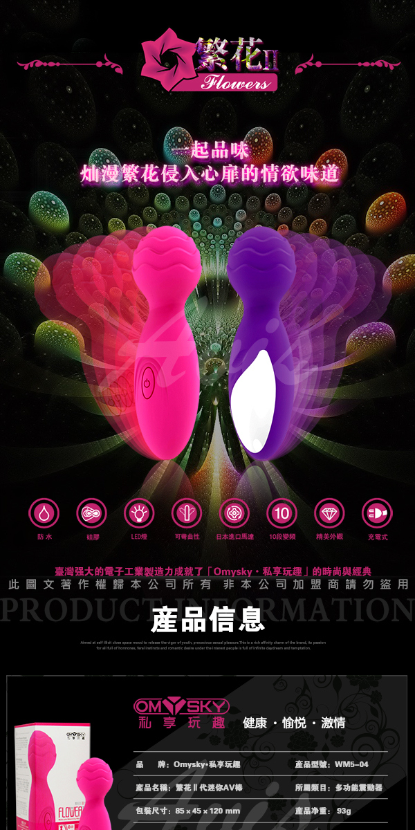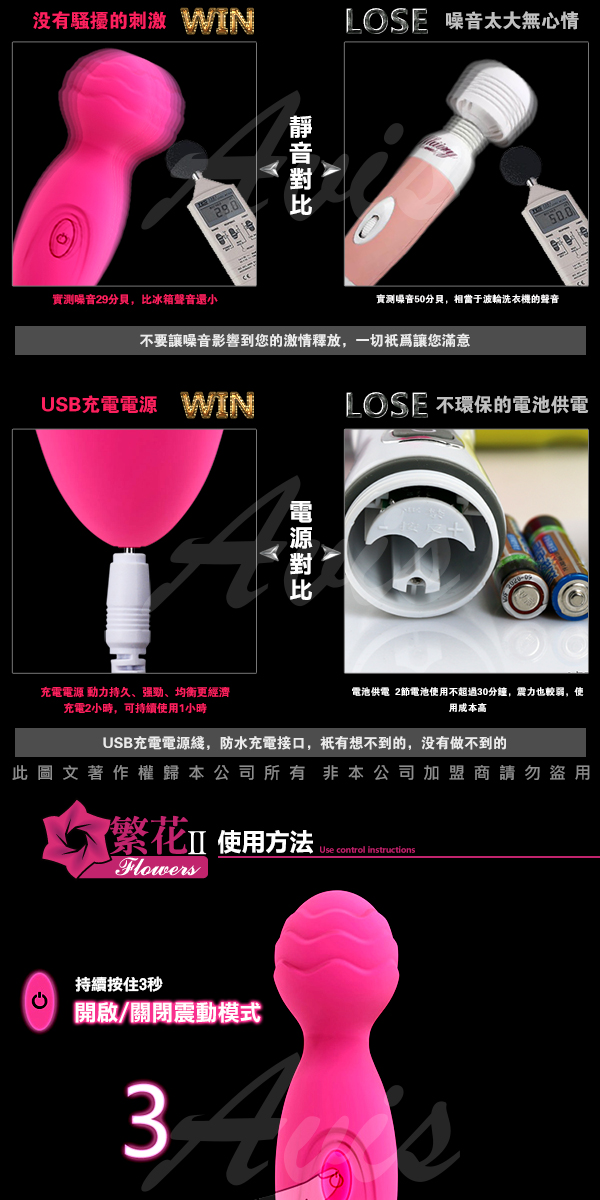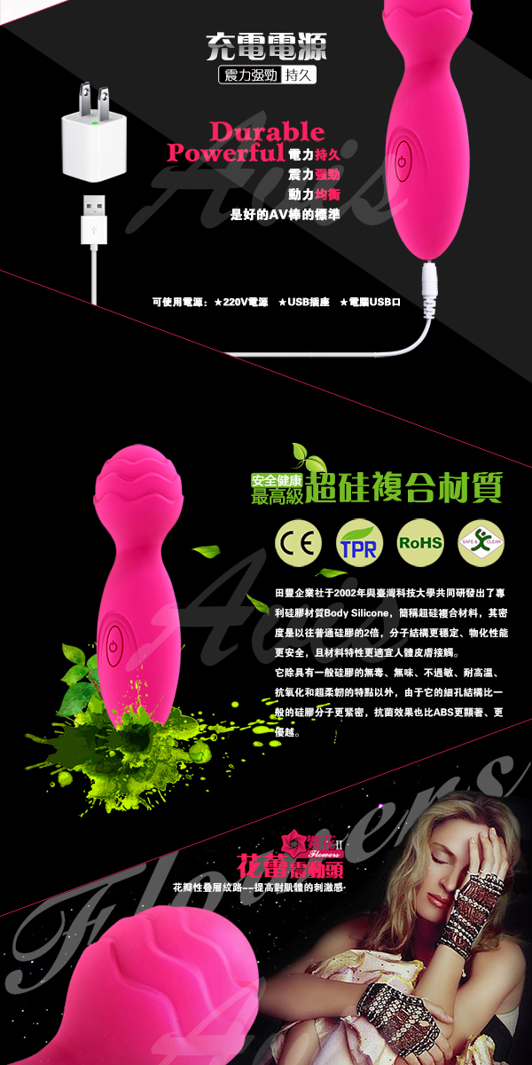 繁花Ⅱ帶迷你AV棒,在延續AV棒經典造型的同時,創新的將AV棒迷你化,並採用充電方式為電力來源,即方便了攜帶,