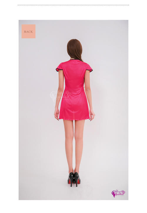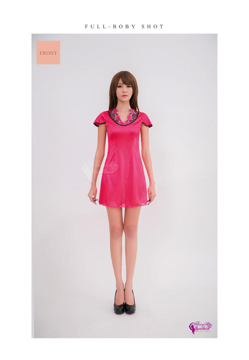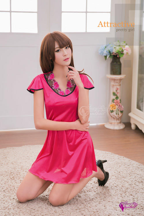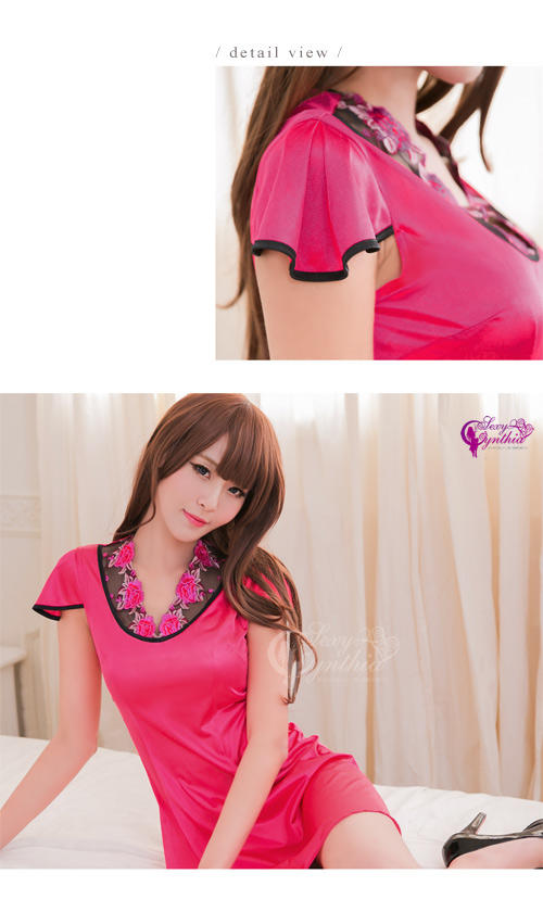 領口處黑色網紗搭配桃紅花朵刺繡,