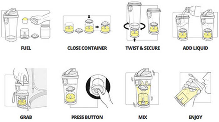 只要填充您的Fueler 蛋白/營養粉補充匣,運動能量手搖杯就是您最佳的能量水壺!需要時釋放第一個粉匣,再依序替換,重覆此一動作即可隨時補充能量。