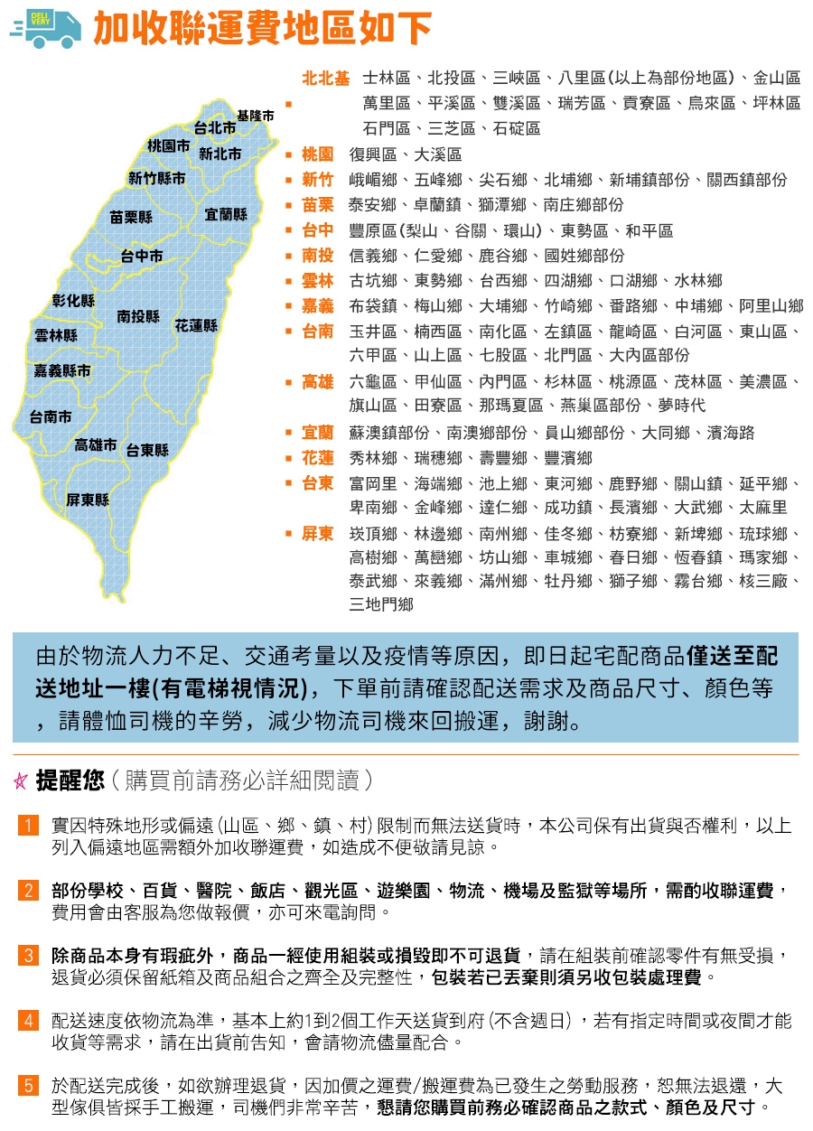 3.如須運送至偏遠山區鄉鎮等地區須酌收運費,運費由本公司貨運部門評估,若有退貨之情形加購運費恕無法退還。