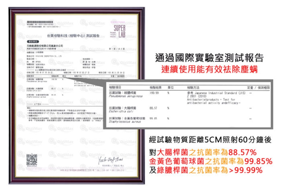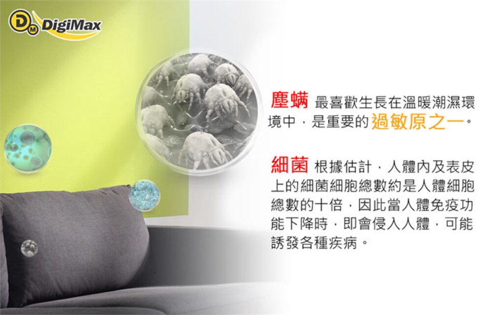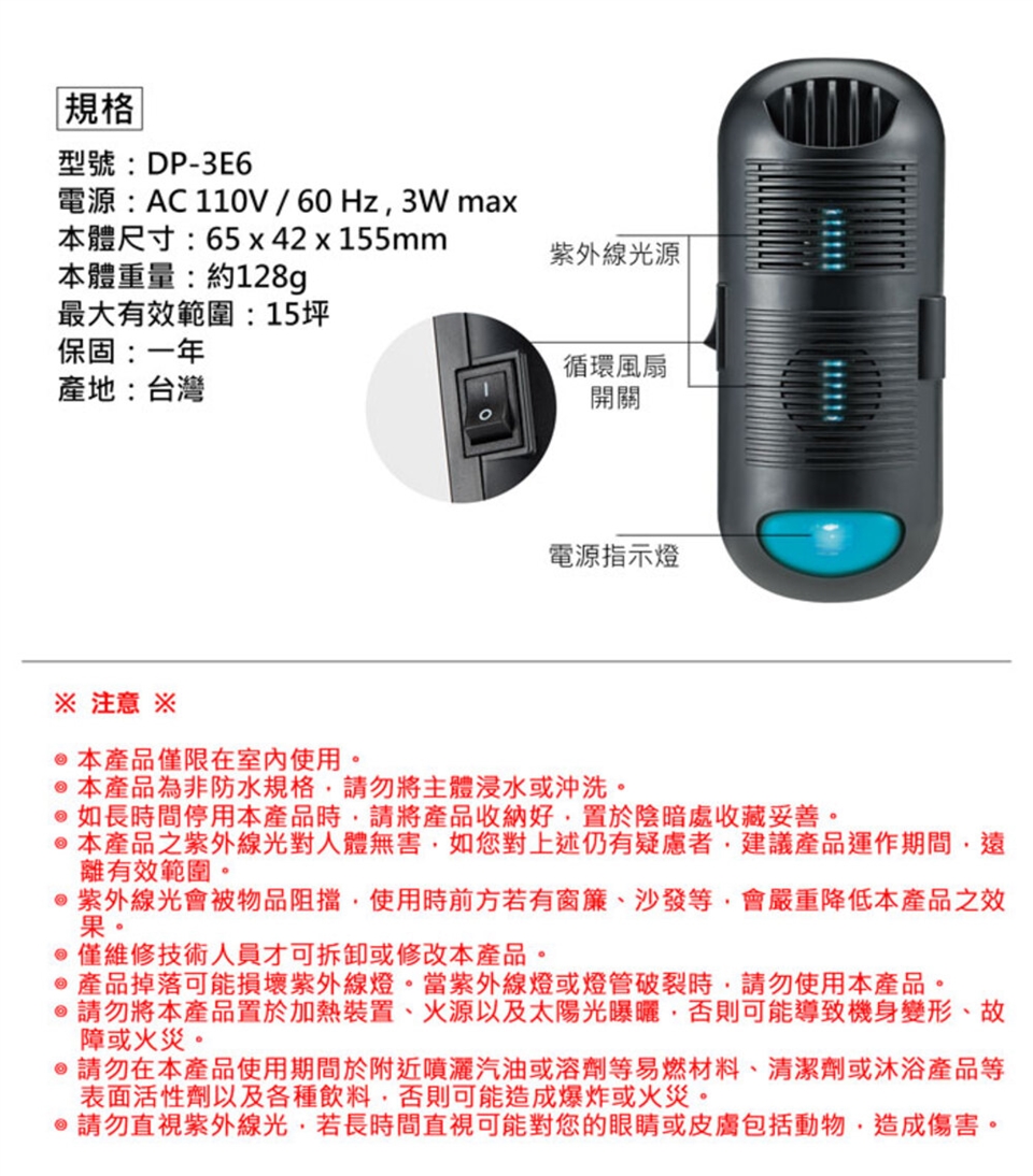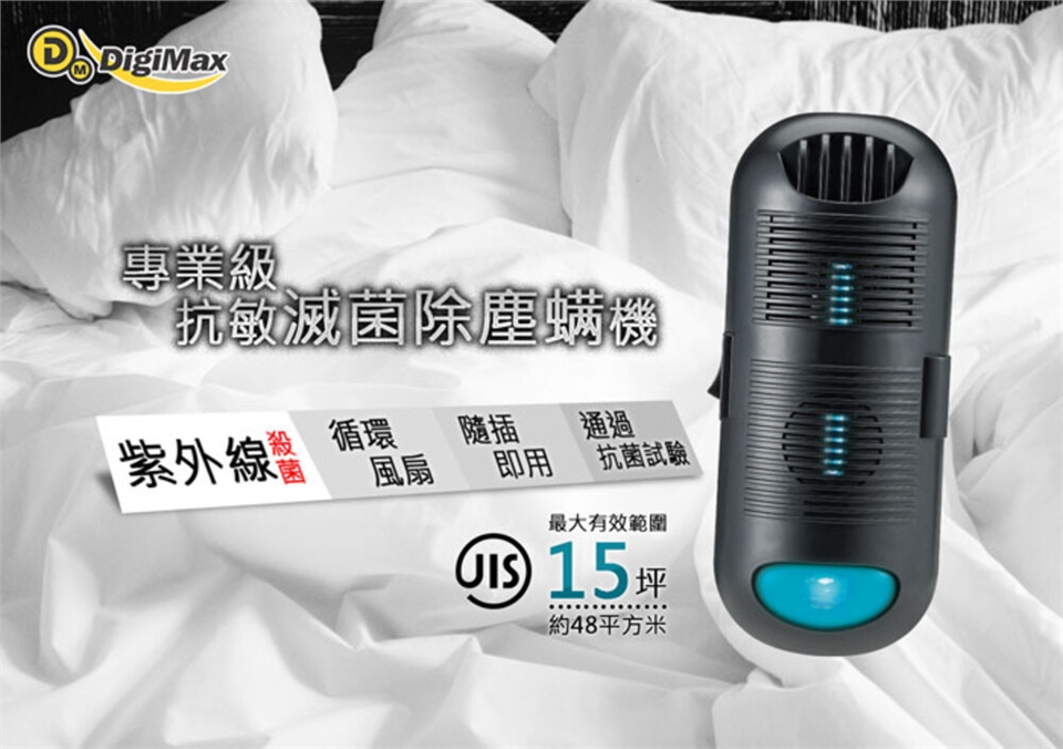 ● DigiMax★DP-3E6 專業級抗敏滅菌除塵螨機,使用空間範圍約15坪。 ● DigiMax★DP-3E6 紫外線滅菌,為模擬太陽光照射滅菌驅除螨,有效消除空氣中的細菌及塵螨。 ● DigiMax★DP-3E6 可自行開啟循環風扇加速空氣中紫外線滅菌的對流性。 ● DigiMax★DP-3E6 通過日本工業標準JIS Z 2801(2010)抗菌試驗,品質有保證。 ● DigiMax★DP-3E6 簡單操作,方便維護,直接將產品插上110V的插座,即開始運作。 ● DigiMax★DP-3E6 台灣製造一年保固,並且提供您最滿意的售後服務。 |