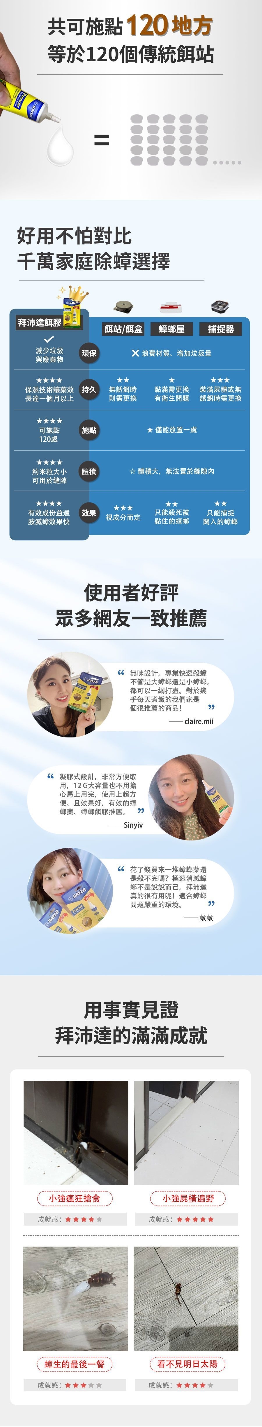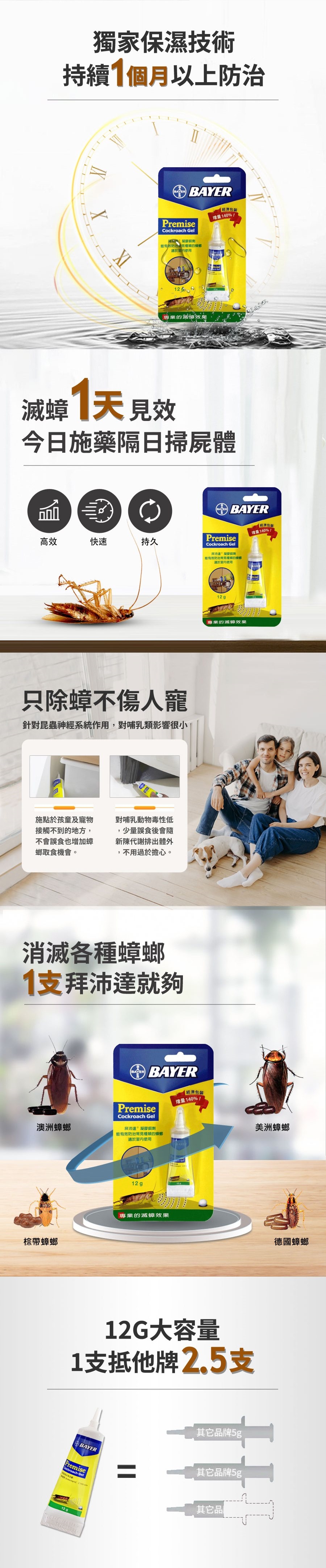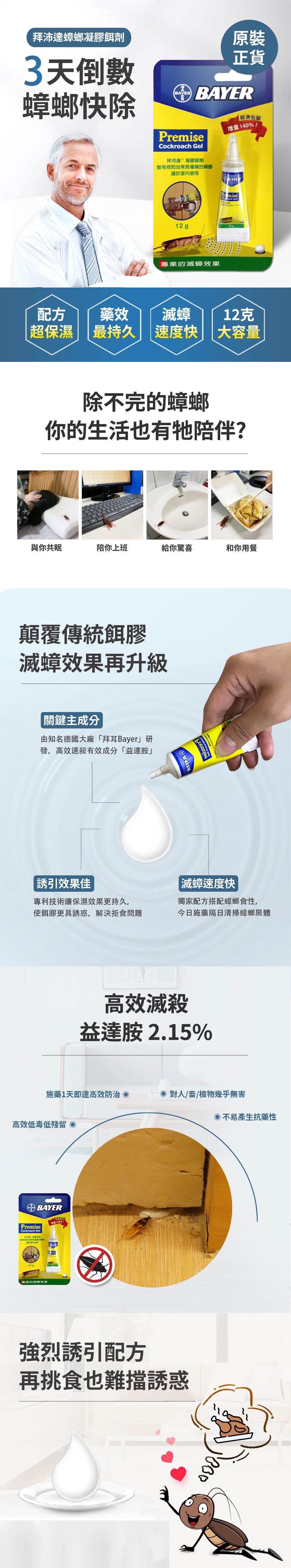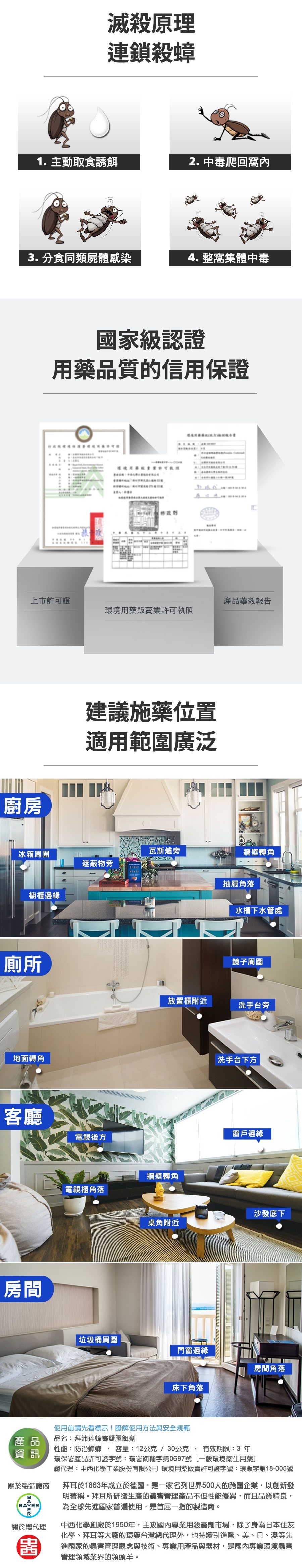 適用範圍:將本餌劑以注射方式,點狀施用於蟑螂常出没及躲藏處,如各縫隙、牆角、裂縫、櫥櫃及流理檯轉角之裂孔,電器設備內儘可能接近蟑螂存在的地方。