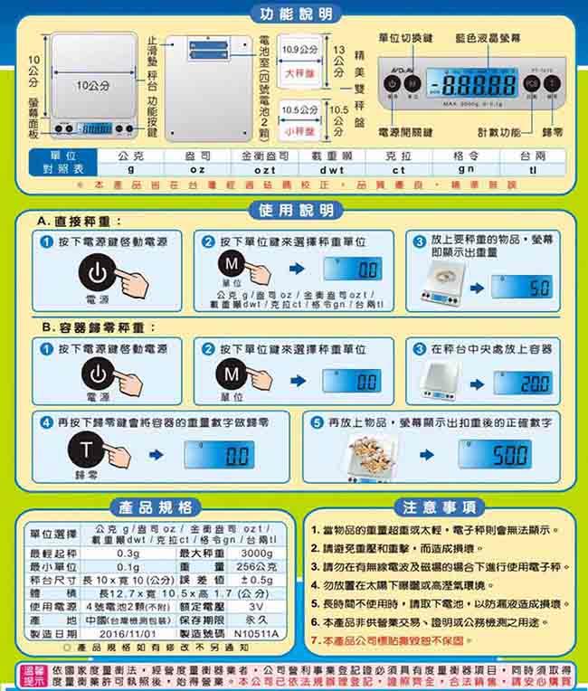 ※ 本產品並無防水功能,秤液體產品,避免漏液滲入本體,以免損壞。