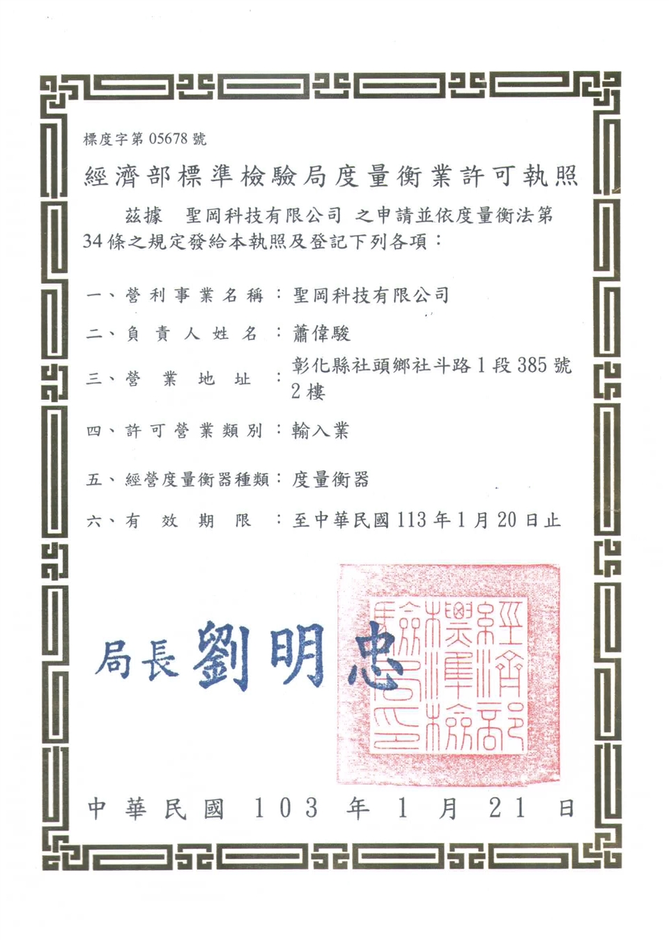 ※ 依國家度量衡法,經營度量器業者,公司營利事業登記證必須具有度量衡項目,同時須取得度量衡業許可執照,使得營業。