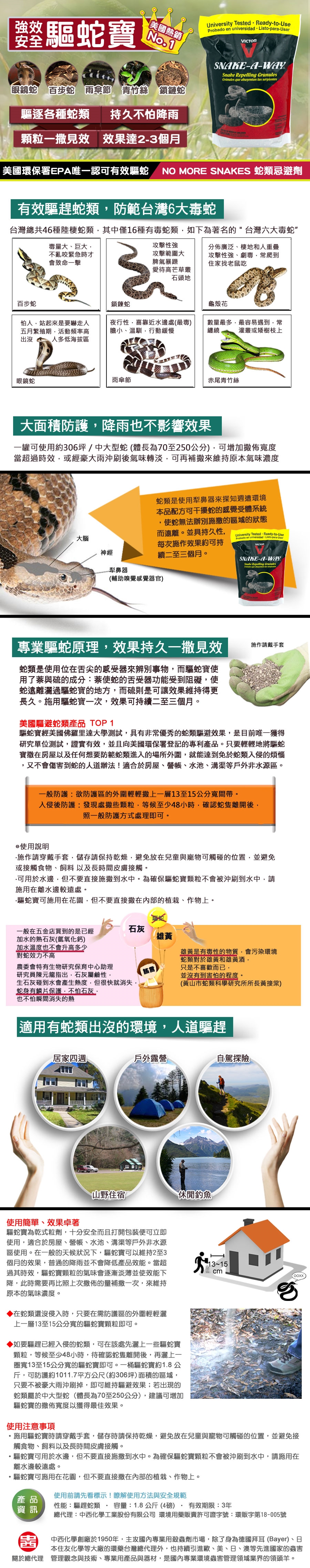 ‧施用驅蛇寶時請穿戴手套,儲存時請保持乾燥,避免放在兒童與寵物可觸碰的位置,並避免接 觸食物、飼料以及長時間皮膚接觸。