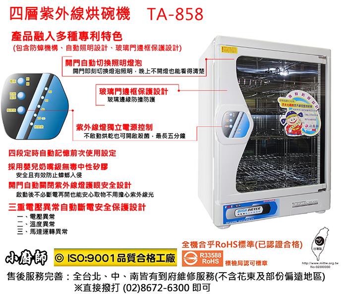 【小廚師】紫外線殺菌靜音定時四層烘碗機TA-858W(雪亮白)