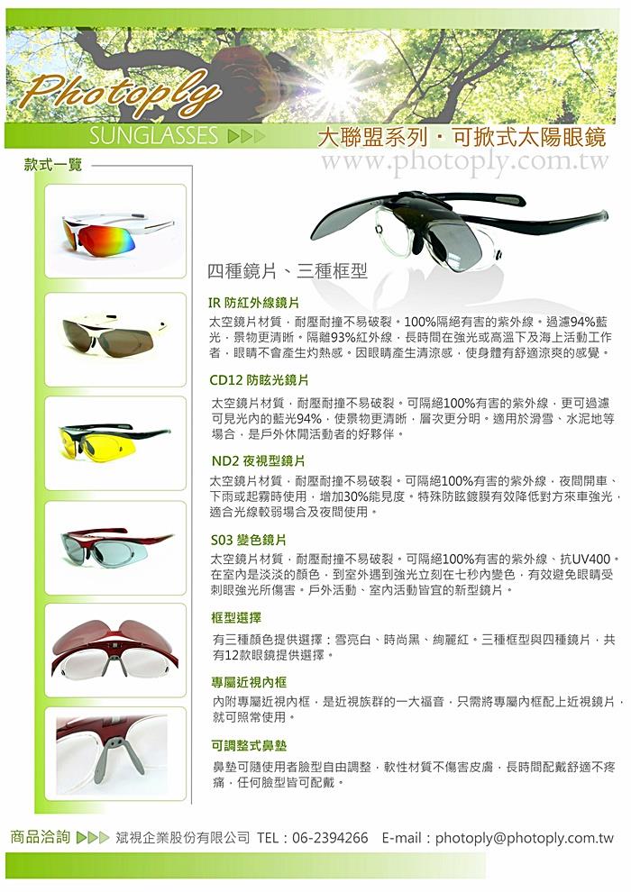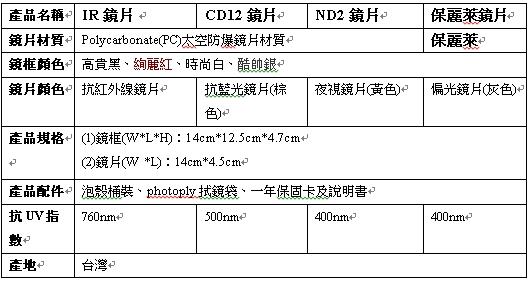 下表是Photoply各式太陽眼鏡的相關規格數據比較表: