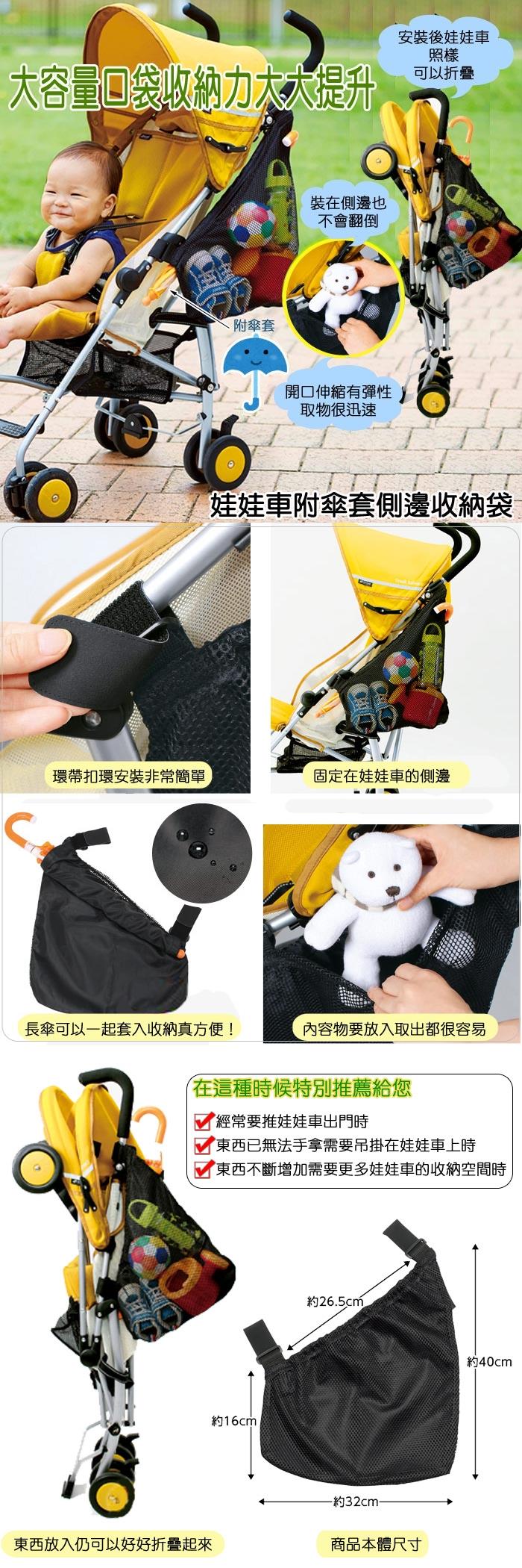 這個[娃娃車附傘套側邊袋]安裝好後,車子依然可以好好折疊,將東西收納進去後,也仍可以把娃娃車折好,搬運時袋子有大開口且有彈性,拿東西依然好拿!