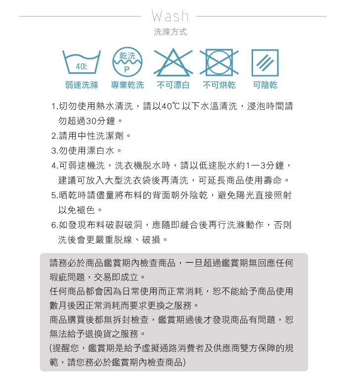 任何商品都會因為日常使用而正常消耗.恕不能給予商品使用數月後因正常消耗而要求更換之服務. 商品購買後都無拆封檢查.鑑賞期過後才發現商品有問題.恕無法給予退換貨之服務. (提醒您.鑑賞期是給予虛擬通路消費者及供應商雙方保障的規範.請您務必於鑑賞期內檢查商品)