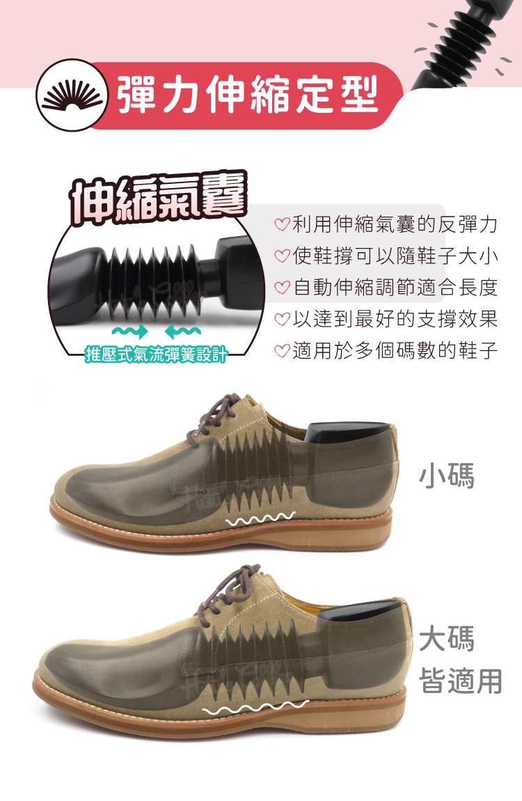 利用伸縮氣囊的反彈力,使鞋撐可以隨鞋子大小,