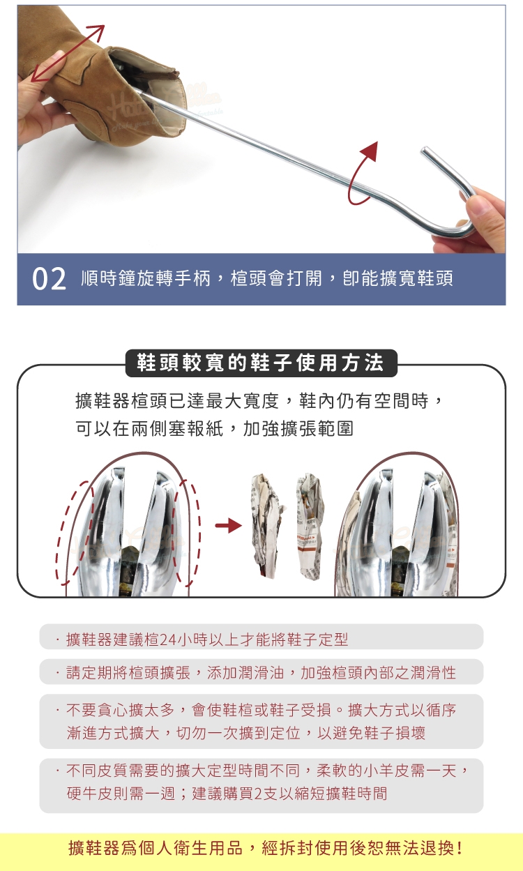 2.擴鞋器建議楦24小時以上才能將鞋子定型