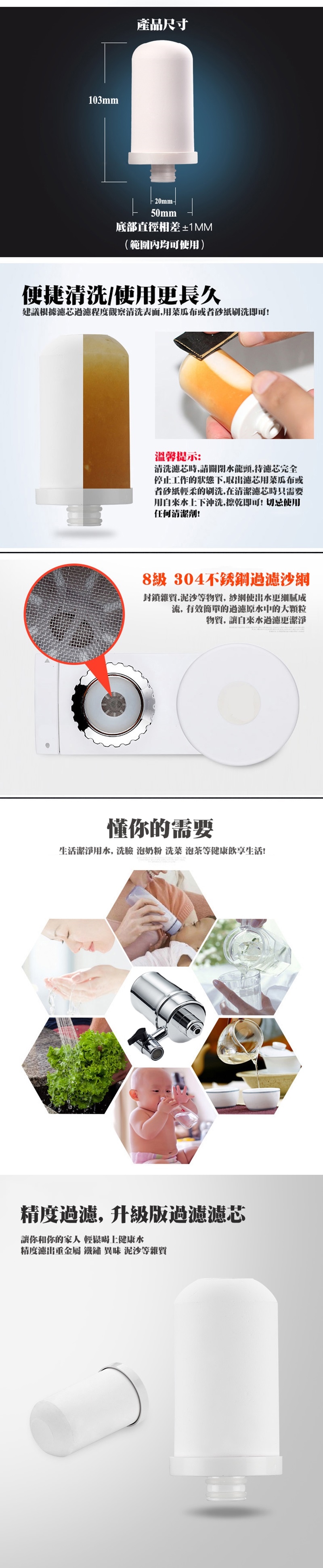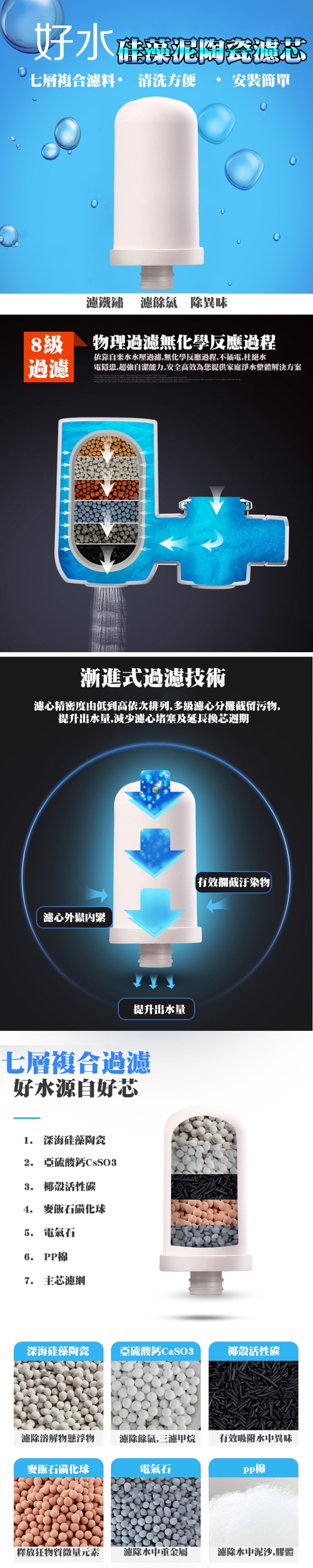 濾心材質:硅藻陶瓷、亞硫酸鈣、椰殼活性碳、麥飯石、電氣石、PP棉、濾網
