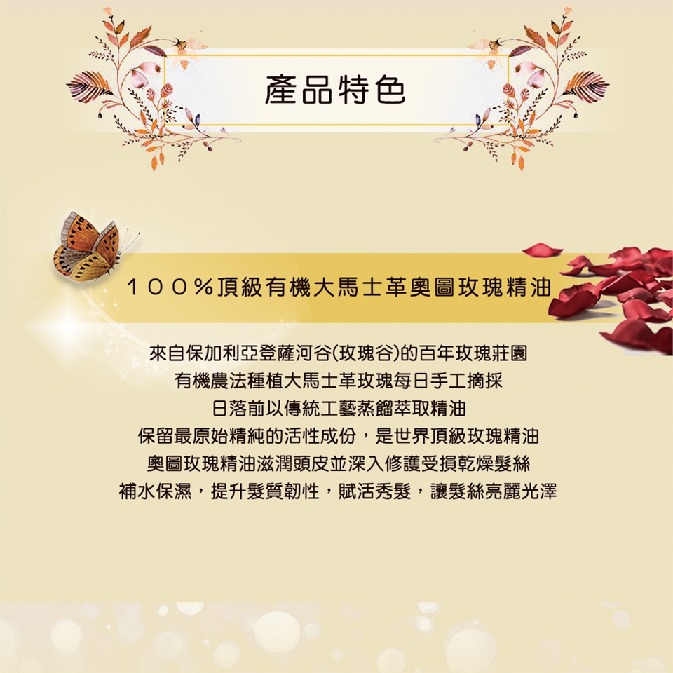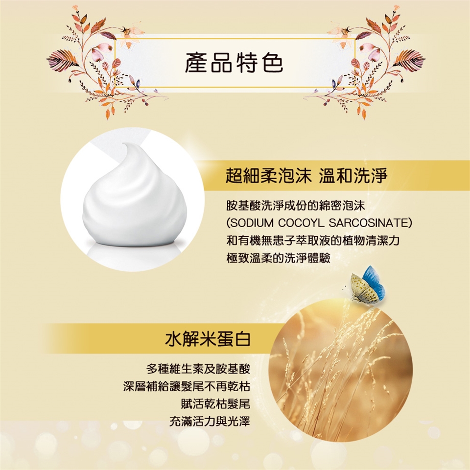 用法:抹於濕髮後輕柔按摩起泡,再以清水徹底洗淨。