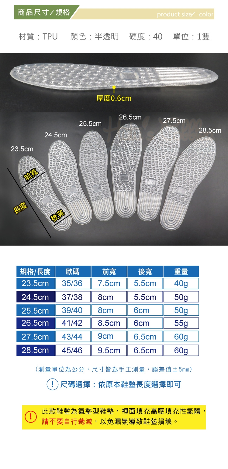 請不要自行裁減,以免漏氣導致鞋墊損壞。