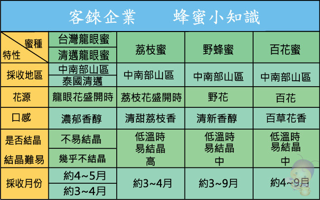 2.氣味及結晶: 具持有植物的花香味,細緻呈乳白色。因蜜源不同,結晶不一。