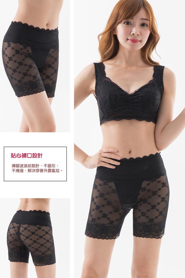 褲頭佈滿緹花蕾絲,展現女性優柔感。