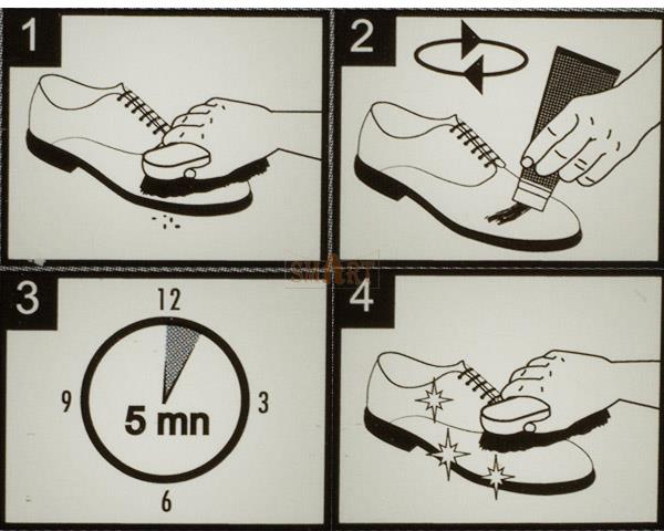 刷去表面泥塵,利用所附的海綿刷頭塗勻,靜待至5分鐘後再以鬃鞋刷或棉布拋光。最後清洗海綿刷頭以延長海綿壽命。