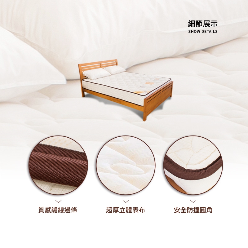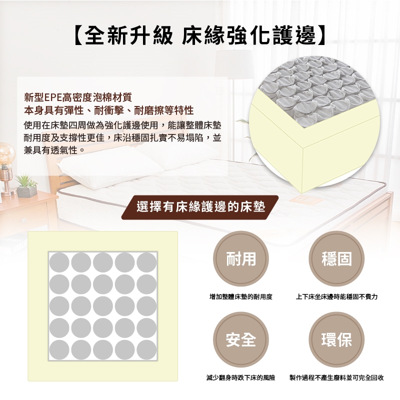 升級EPE高密度泡棉床緣強化護邊,增加整體床墊耐用度,減少翻身跌下床風險!
