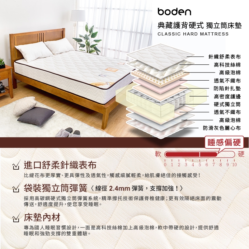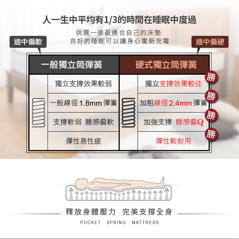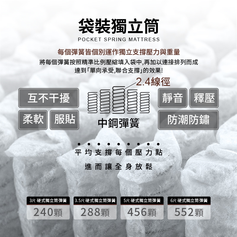 2.4mm線徑硬式彈簧,精準撐托技術,保護脊椎健康,使您享受舒適睡眠體驗!