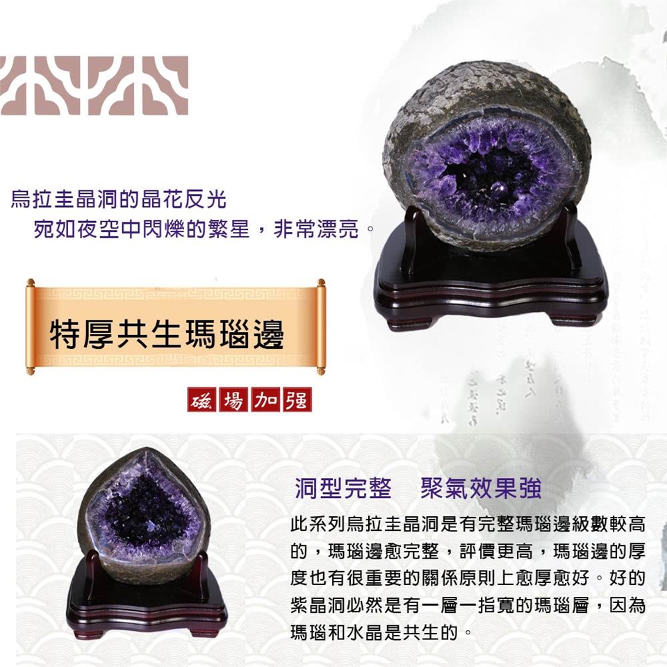 此系列烏拉圭晶洞是有完整瑪瑙邊級數較高的,瑪瑙邊愈完整,評價更高,瑪瑙邊的厚度也有很重要的關係原則上愈厚愈好。好的紫晶洞必然是有一層一指寬的瑪瑙層,因為瑪瑙和水晶是共生的。