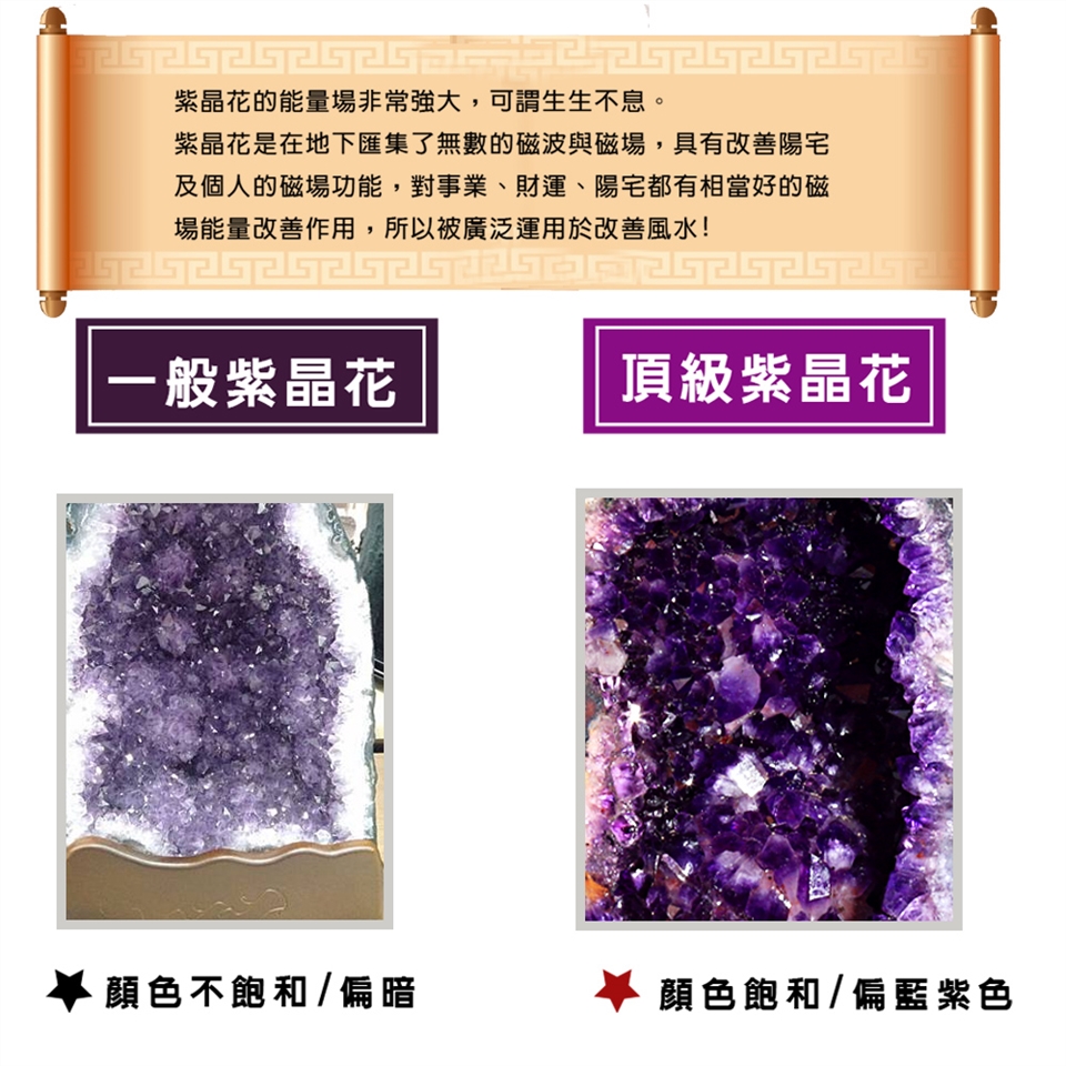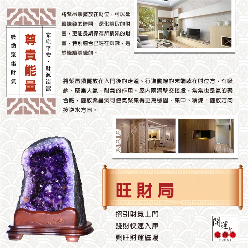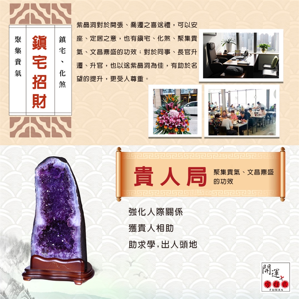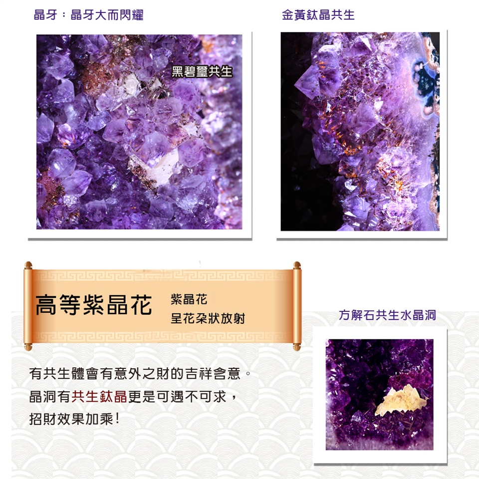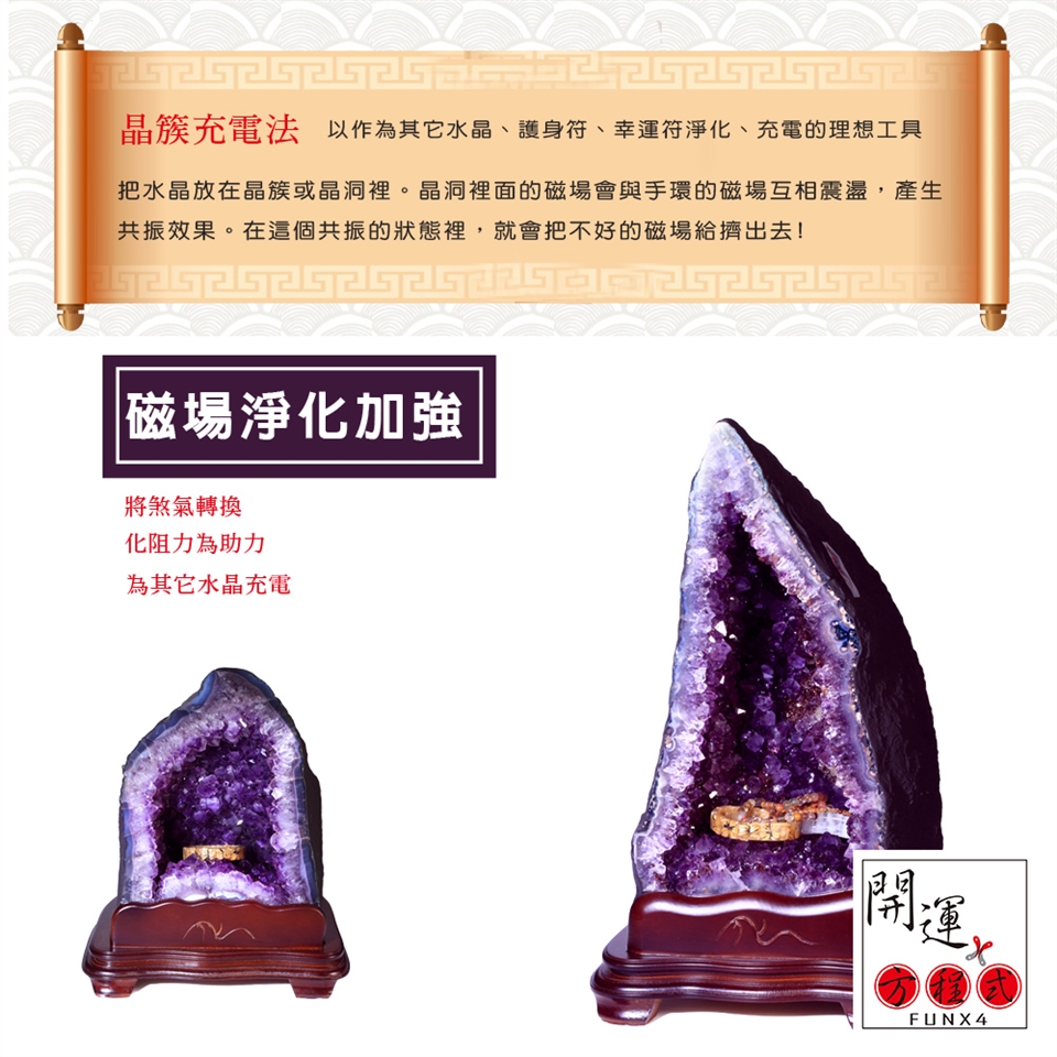 紫晶洞為佛教七寶之一,在所有水晶中具王者的「尊貴之氣」,除了有藝術之美以外,還具有改善陽宅及個人的磁場功能。