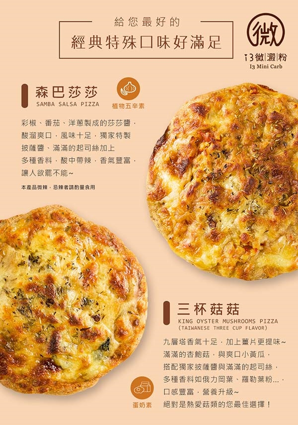 黃金亞麻仁籽粉、杏仁粉、藜麥粉)、三杯菇(杏鮑菇、九層塔、老薑)、披薩醬(水、番茄糊、