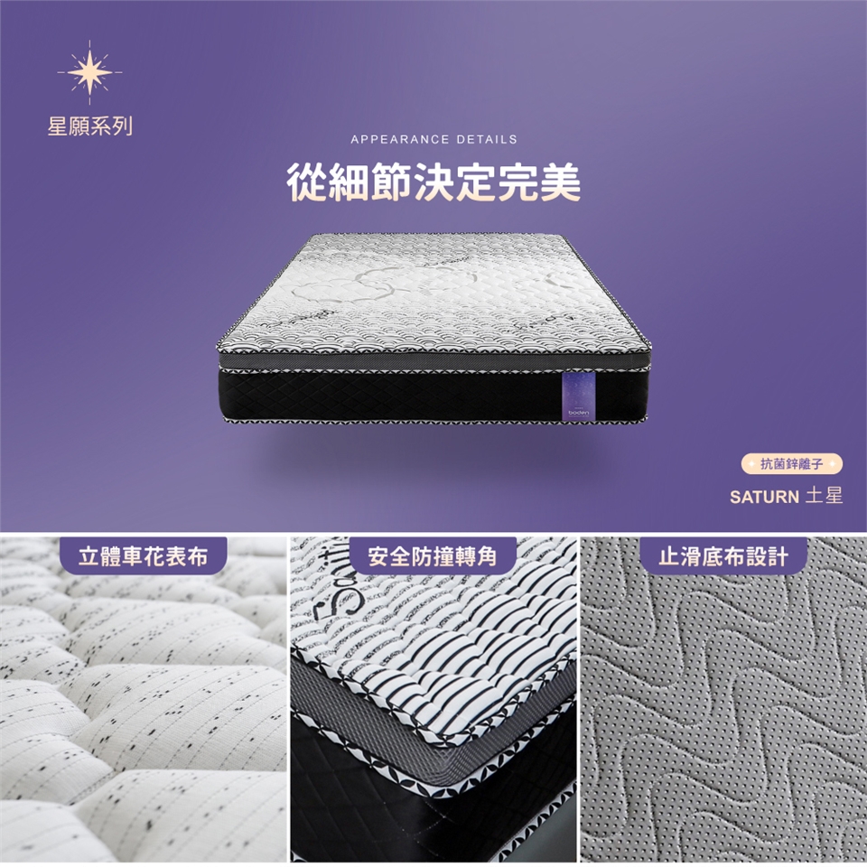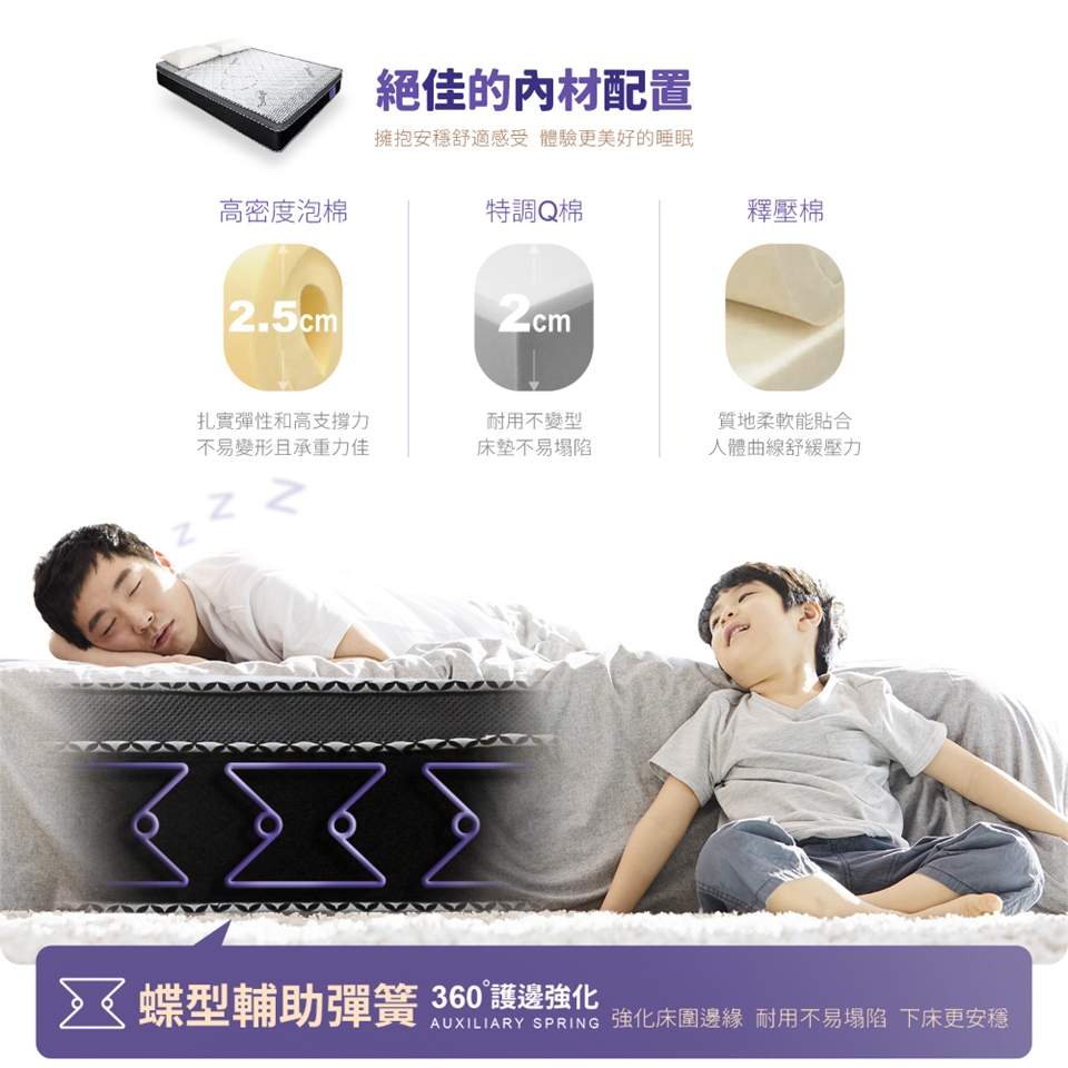 蝶型輔助彈簧護邊設計,穩固床緣強化支撐,更能有效增加床墊耐用度。