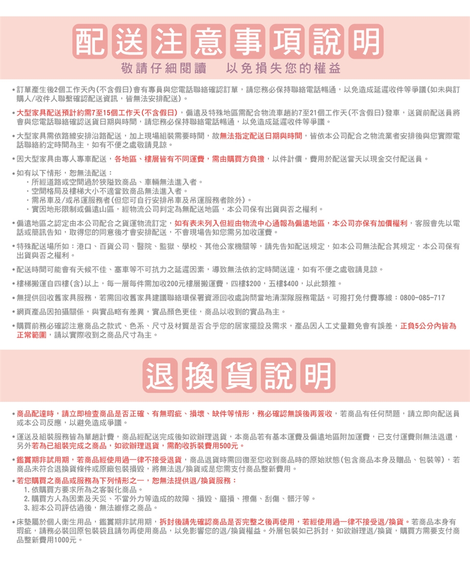 (3)床墊均為接單後製作,師傅手工製作約需5-7個工作日,如無法等待者請審慎購買。