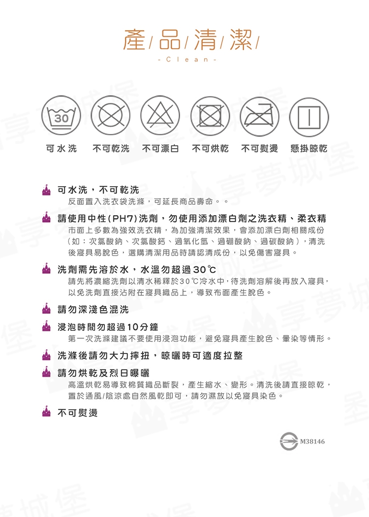 .中性清潔劑:為了保護寢具的壽命請選用(PH值為7)的清潔劑,勿使用含漂白成份或強效護色之洗劑或柔軟精。