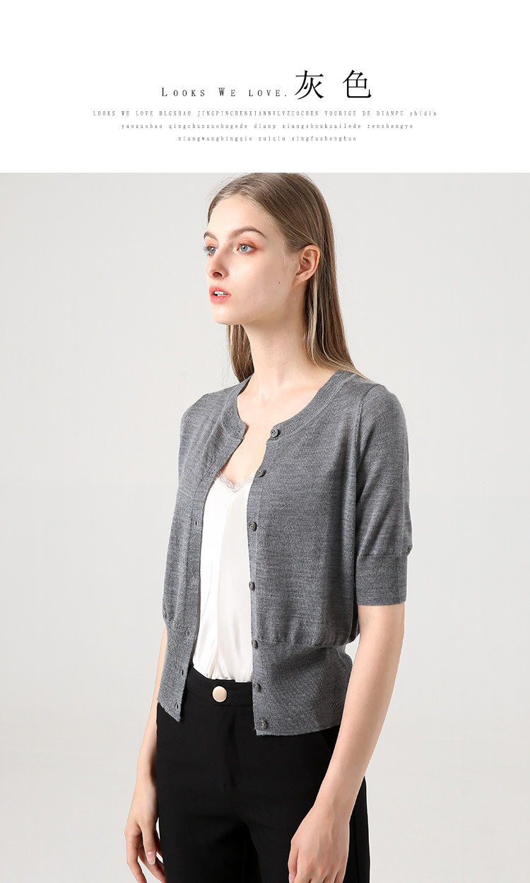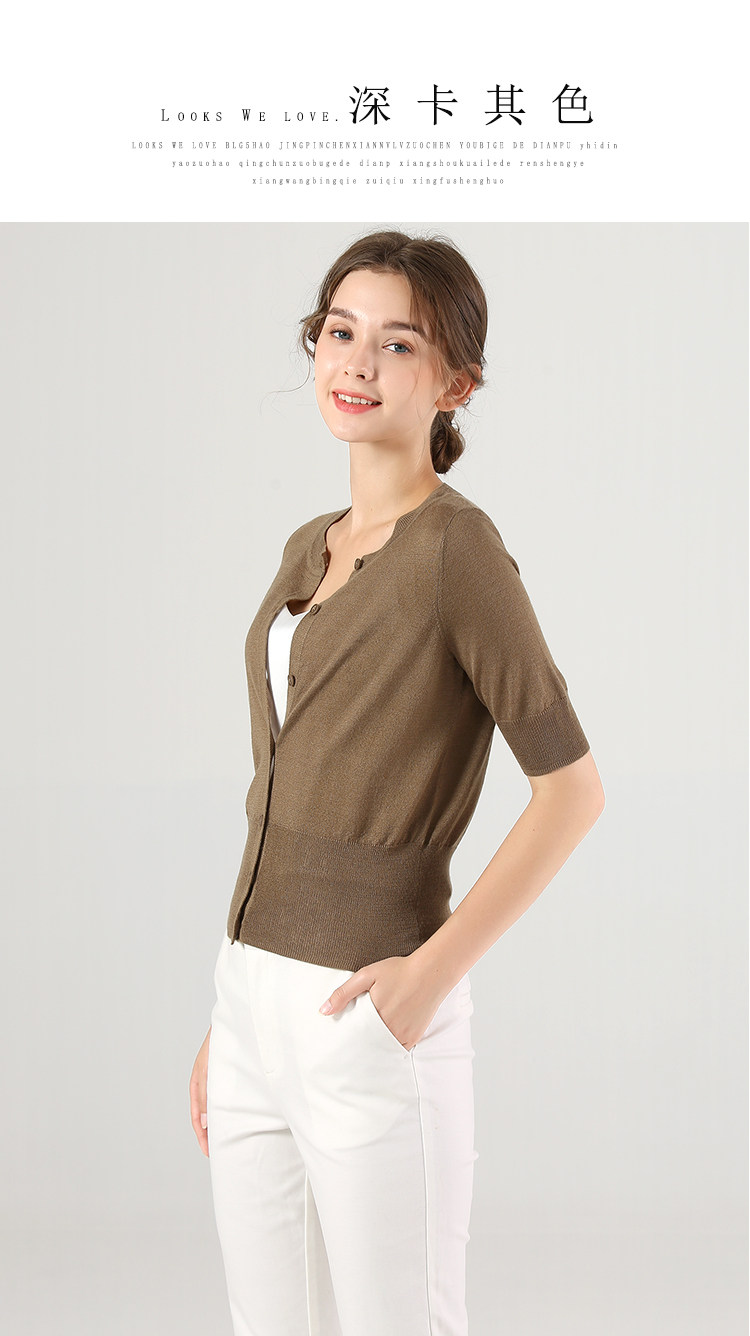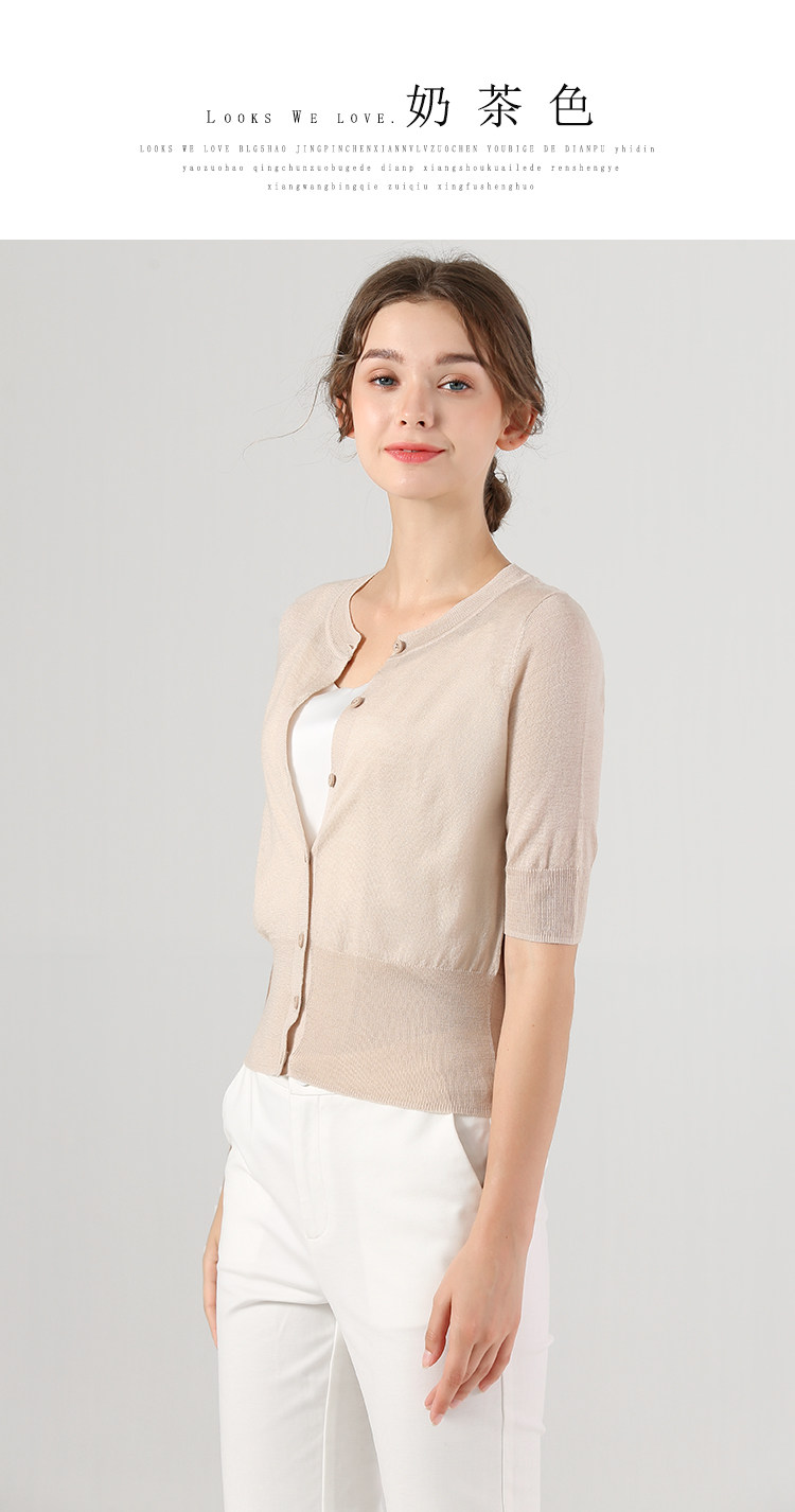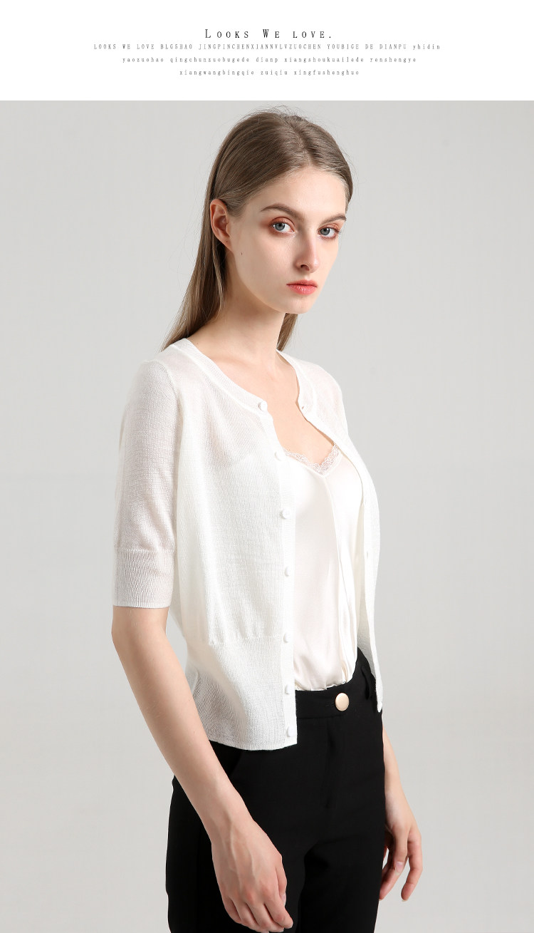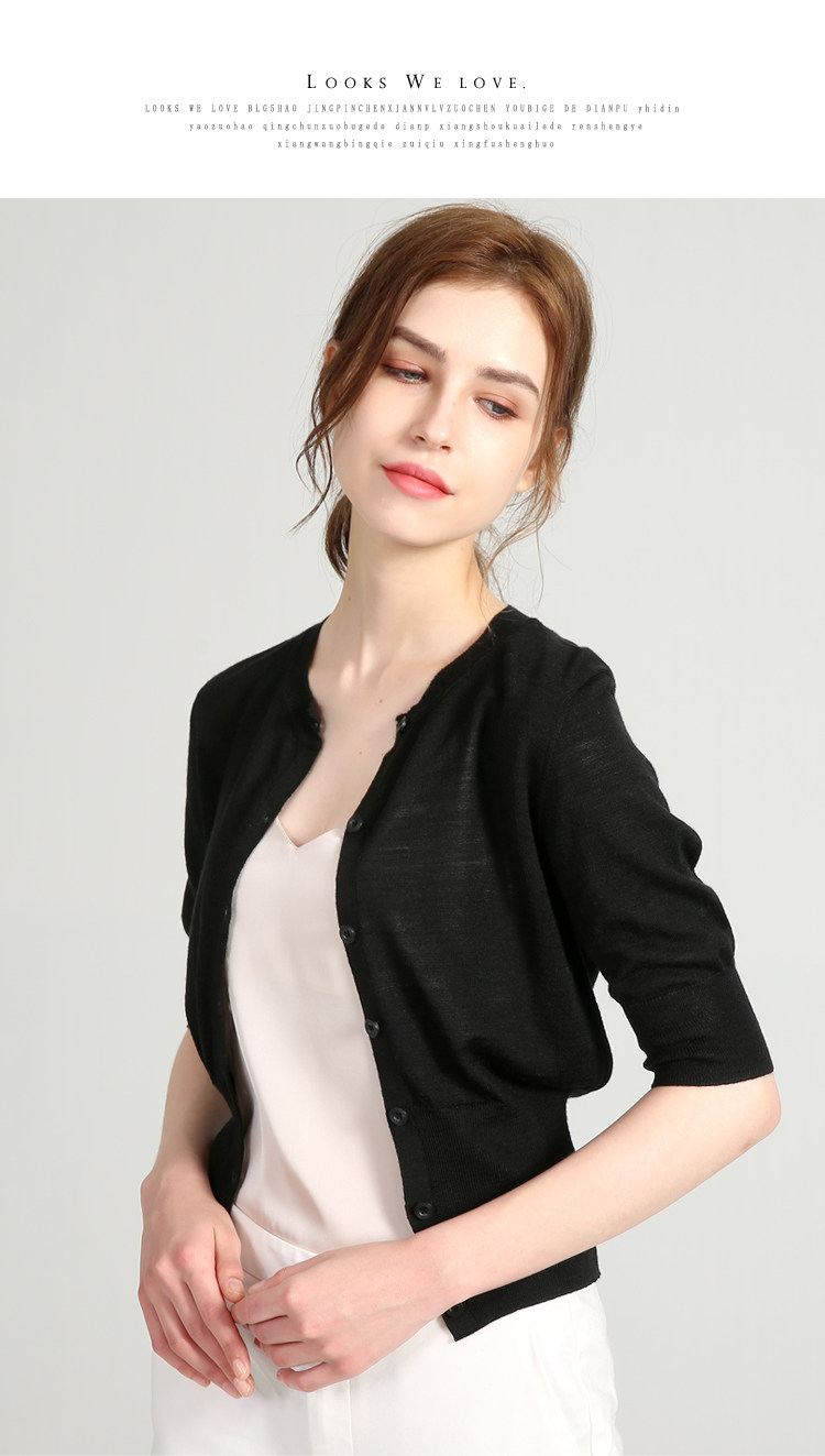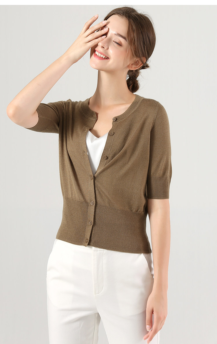 復古,美的內在氣質 短款,小圓領,自帶高腰線 上身效果顯高,顯瘦 針織衫小開衫,即是小外套,也是貼身上衣 超薄面料,舒適親膚,夏天穿涼爽透氣。