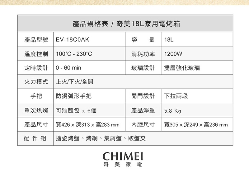 【CHIMEI奇美】18L家用電烤箱 (EV-18C0AK)